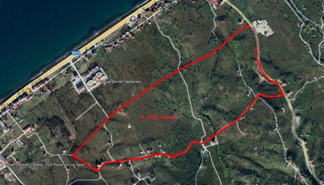 Sanayi ve Teknoloji Bakanlığı Sanayi Bölgeleri Genel Müdürlüğü’nün 05.02.2021 tarihli ve 2298918 sayılı yazılarına istinaden oluşturulan yer seçimi komisyonu tarafından Espiye ilçesi Adabük Mahallesi ve Tirebolu ilçesi Düzköy köyü mevkiinde bulunan 63 hektar büyüklüğündeki ortak alan incelenmiş ve 24.02.2021 tarihli raporlarıyla Organize Sanayi Bölgesi kurulması uygun olarak değerlendirilmiştir.